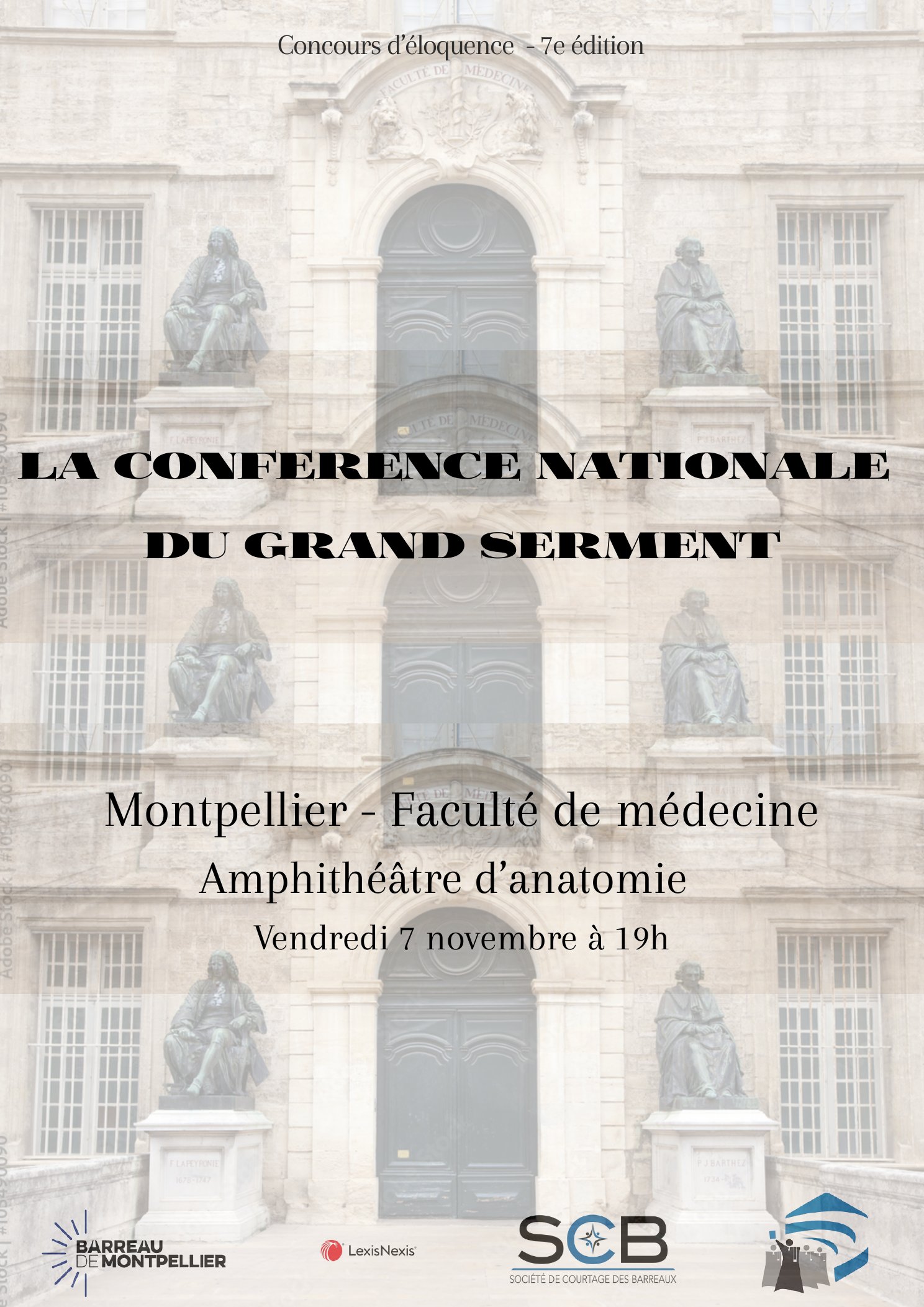 La 7ème édition du concours de la Conférence nationale du grand serment, organisé sous l'égide de la Conférence des bâtonniers, se déroulera le 7 novembre prochain, à l’Opéra de Montpellier, barreau d’inscription du lauréat de la précédente édition.